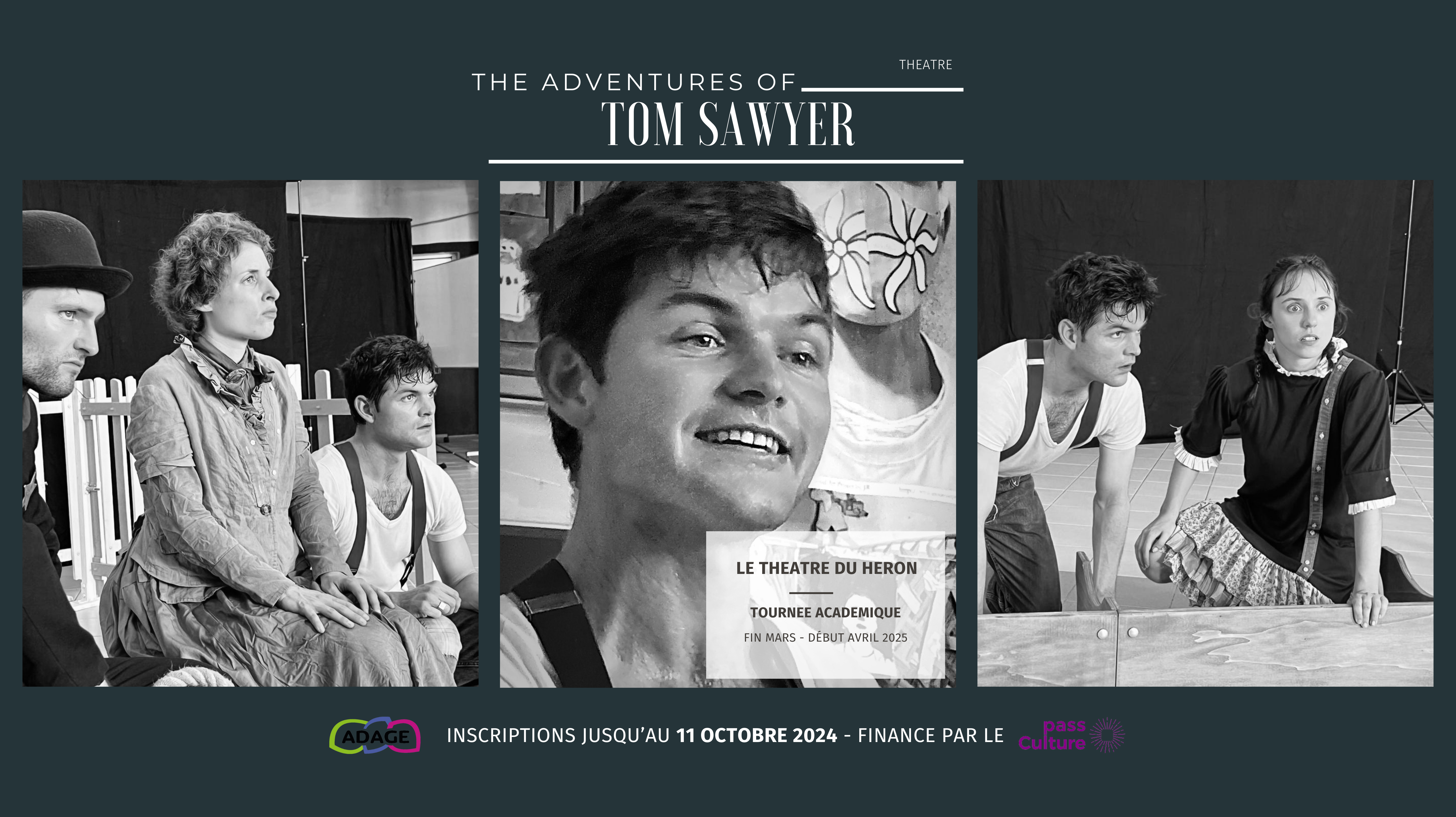 Destinée tant aux collégiens qu’aux lycéens, cette adaptation théâtrale de The Adventures of Tom Sawyer mêle interaction avec le public, jeu physique et chansons. Les cinq comédiens, incarnent enfants et adultes, explorant les relations sociales dans les années 1840, le long du Mississippi. La chronologie se construit autour des "journées d’école", bien que Tom préfère échapper à l’école pour vivre des aventures excitantes...